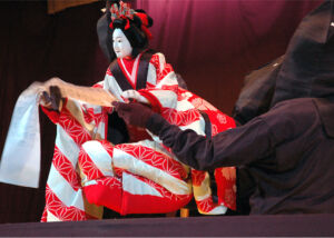 Towards the end of the 16th century a new form of Japanese theatre art began to develop in Kyôto from the performances of Izumo no Okuni, a dancer from the Shintô shrine Izumo-taisha. This form of variety show, in which women were banned from performing from 1629 onwards, was perfected during the Edo period (1603-1868). Kabuki, mainly cultivated by the bourgeois class, became, next to Nô and Bunraku, the most important classical theatre form in Japan. The art of onnagata, the male female actors, reaches its highest perfection.
