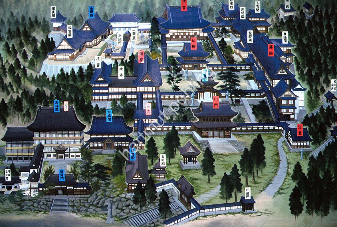 Buddhist monastery which is one of the two main monasteries in the lineage of Sōtō Zen. It was founded in the mid-13th century by the priest Dōgen, who turned to an ascetic life after his stay in China. Construction of the first complex was completed in 1244 and went by the name Daibutsu-ji (“Temple of the Great Buddha”). In 1246, the site was renamed Eihei-ji, which is also the name of the municipality in whose area the temple is currently located. After its complete destruction in 1473, it was not rebuilt until about 100 years later.