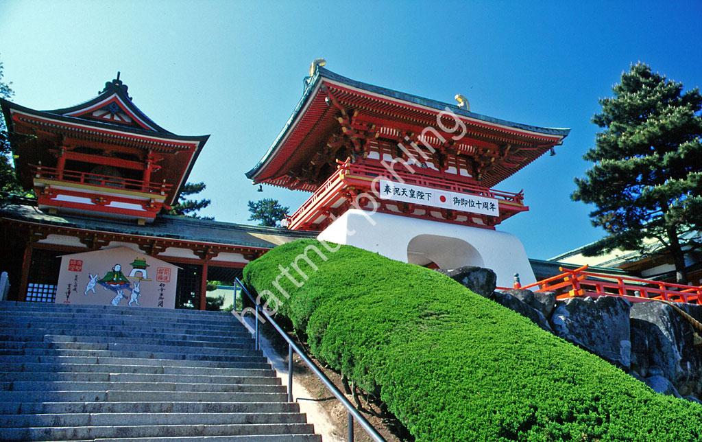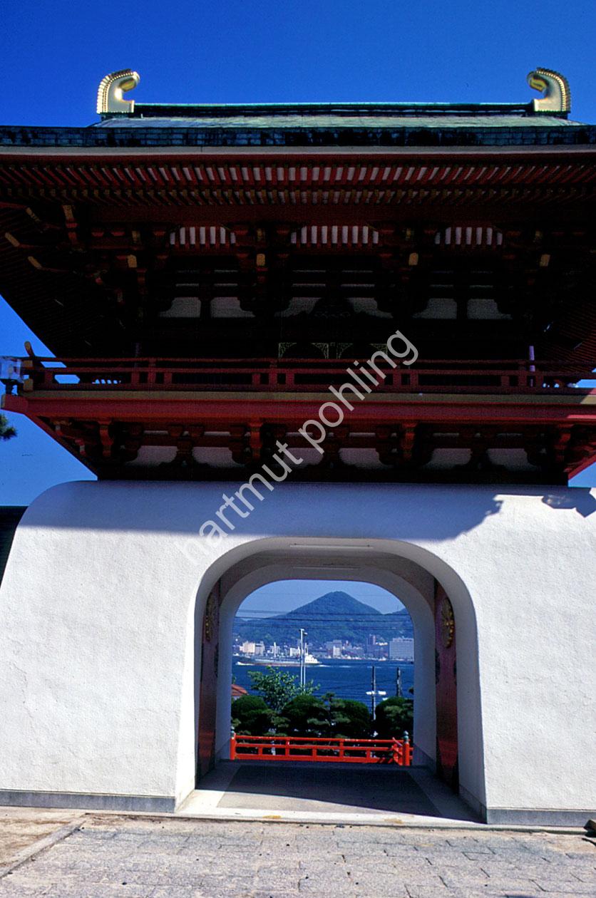 Akama-jingû is located between the main islands of Honshû and Kyûshû at the strait of Shimonoseki. The shrine was founded for the salvation of the child emperor Antoku (1178-85), who drowned in a naval battle – the “Taira” (or “Heike”) and the “Minamoto” (or “Genji”) fought in 1185 at Dan-no-ura near the present Kanmon-kyôbridge. The Minamoto forces defeated the Taira and secured their rule over Japan for the next 200 years. The shrine, which was declared an imperial burial place by Emperor Go-Toba (1180-1239) in 1191, also contains the graves of important warriors of the Taira clan and a statue of “Hoichi the Earless”.